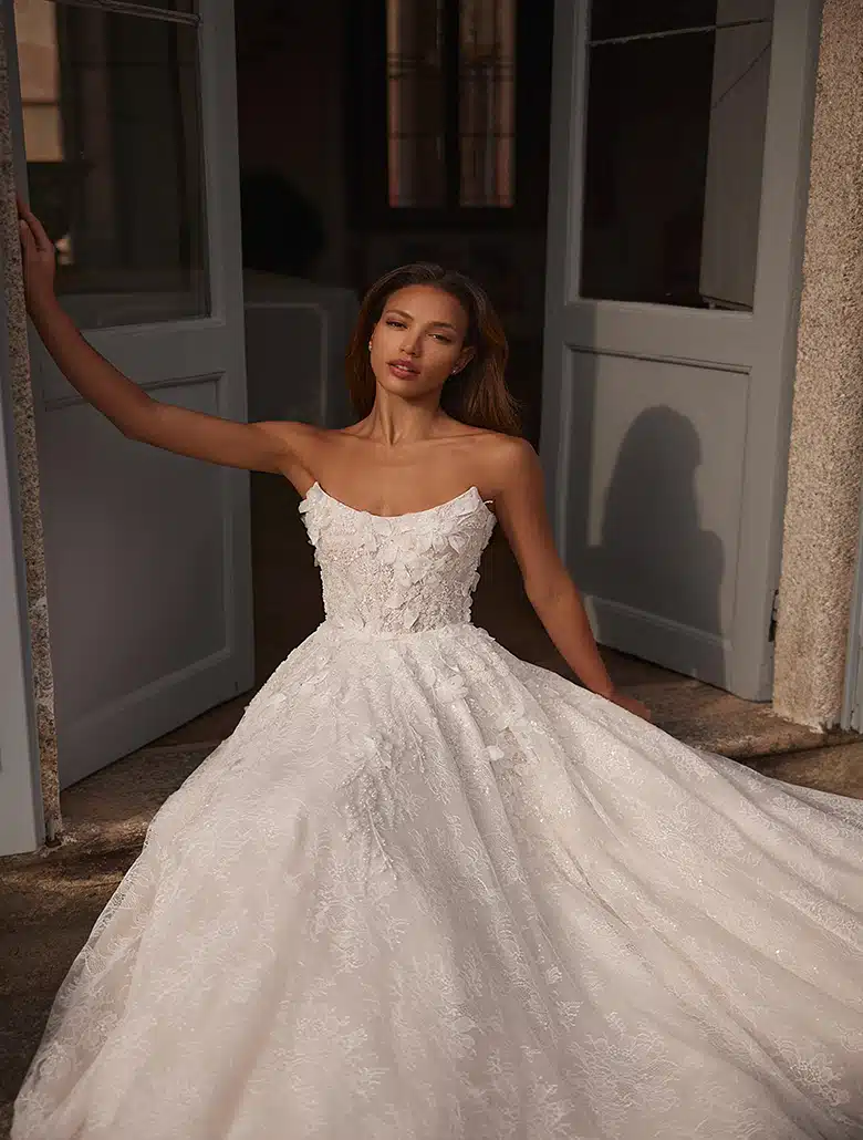 der voluminöse Spitzenrock mit üppiger Schleppe ist kunstvoll mit 3D-Blumen verziert, die der Form des Korsetts folgen. Auch der Rock wird mit einem verdeckten Reißverschluss geschlossen. das Kleid ist auch in Elfenbein erhältlich. Volumiöse, abnehmbare Ärmel aus transparenter, bestickter Spitze runden den luxuriösen Look der Braut perfekt ab.