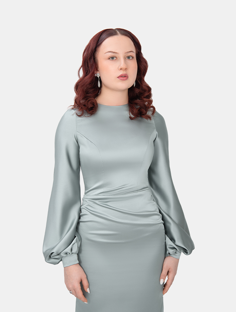 Der hochgeschlossene Schnitt und die langen Ballonärmel verleihen dem Kleid eine edle, zeitlose Ausstrahlung. Die feine Raffung an der Taille schmeichelt der Figur und sorgt für eine wunderschöne, feminine Linienführung.