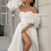 Brides who want to be the center of attention will be delighted with this dress – after all, they know that their presence is the main attraction of the wedding ceremony. The model is made in a wrap style, the skirt has three pleats on the right leg. The original corset is lavishly draped and complemented by detachable puffed sleeves. Fine Prada organza was chosen as the material. This weightless, lightweight fabric gives the dress lightness, elegance and grace. It is perfect for a modern wedding look.