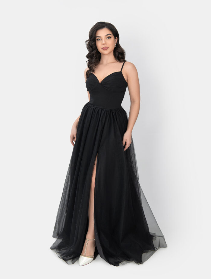 The ,,Faye“ evening dress by Irvalda Evening wear Vienna is a timelessly elegant style that radiates pure class with its clean lines and black color scheme. The figure-hugging bodice with fine spaghetti straps and flattering draped neckline gives the dress a feminine, modern silhouette. The deep sweetheart neckline emphasizes the décolleté and creates a stylish, sophisticated look.