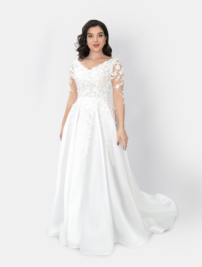 The „Flora“ wedding dress from Irvalda Bridal Fashion Vienna is an elegant, classic and luxurious style that immediately catches the eye with its elegant Mikado skirt. The top made of finely embroidered lace with an off-shoulder effect and V-neckline gives the dress a feminine, romantic character. The half-length sleeves made of transparent lace add extra elegance and give the dress a delicate, harmonious line.