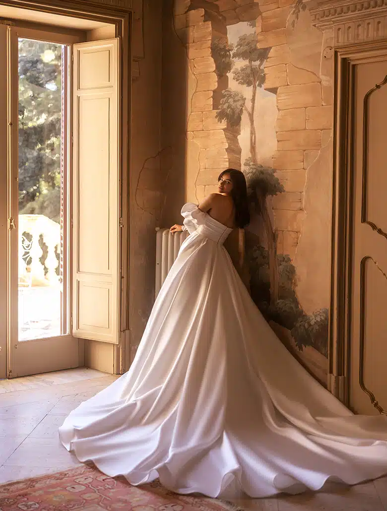 Die anspruchsvollste Braut wird in diesem elfenbeinfarbenen A-Linien-Kleid eine zarte und elegante Prinzessinnen-Ausstrahlung erlangen und zum strahlenden Mittelpunkt jedes bezaubernden Festes werden. Das Oberteil aus Satin hat einen geraden Halsausschnitt und ist im Rückenbereich unterhalb der Schulterblätter leicht konkav. Es ist mit Falten aus Mikado-Stoff verziert und wird mit Haken in der hinteren Mitte geschlossen.