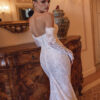Der Rock fließt in einer eleganten, figurbetonten Linie nach unten und endet in einer langen Schleppe, die dem Kleid ein majestätisches Finish gibt.