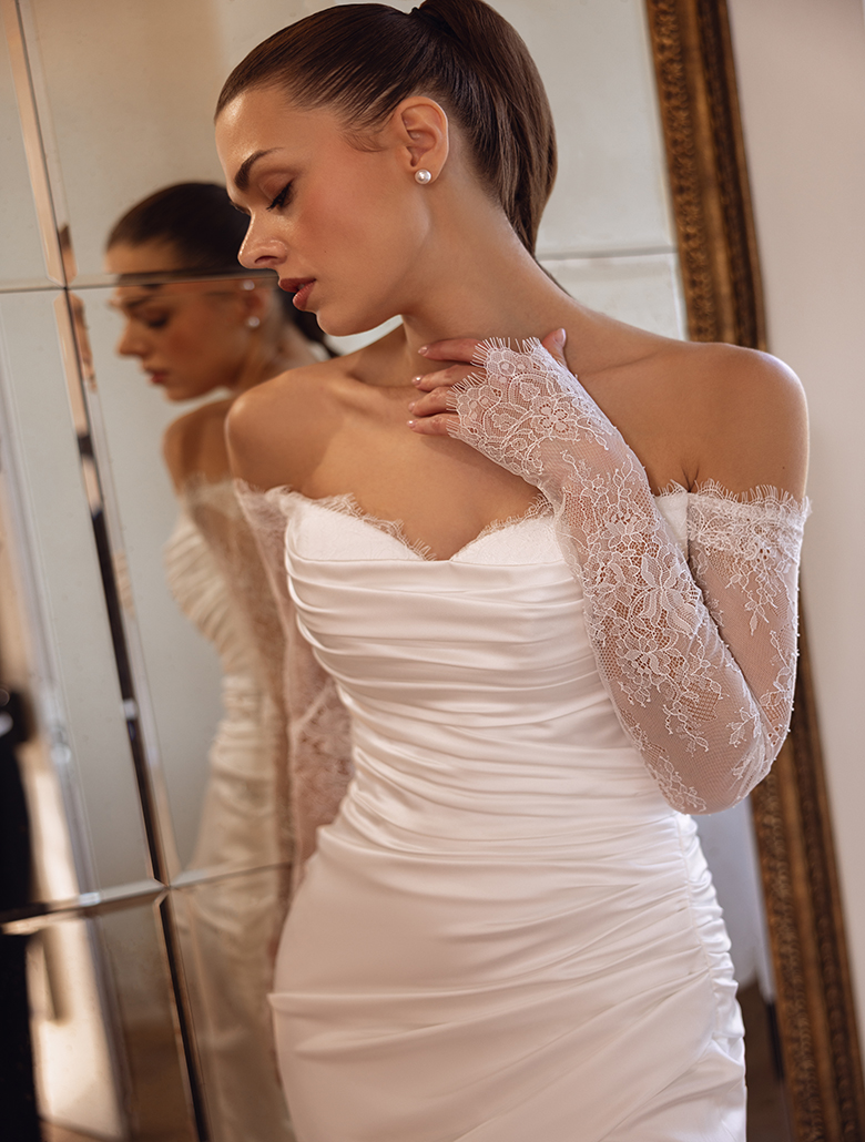 Das Oberteil ist schulterfrei mit zarten Spitzenärmeln, die die Arme sanft umhüllen und einen Hauch von Romantik verleihen. Die feine Drapierung des Mieders schmeichelt der Figur und betont das Dekolleté.