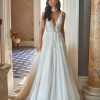 A bride in an A-line dress in a light skin color with an enchanting shimmer will enchant all guests. The semi-transparent top with straps has a V-shaped neckline down to the waist and an oval back. The corset is decorated with appliqués and flowers with a 3D effect. The side inserts of the corset are made of skin-colored mesh, which adds elegance to the dress. The corset fastens with loops and buttons and the luxurious skirt with train has a concealed zipper. The top layer of the skirt is made of lightweight mesh and is decorated with appliqués.