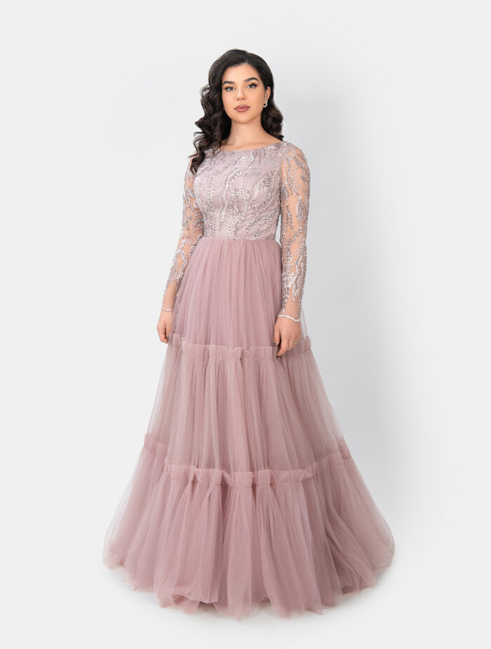 The voluminous tulle skirt with several tiers adds lightness and movement to the design. The soft rose-taupe color emphasizes the feminine radiance and makes ,,Nora“ a real highlight at evening events, engagement parties, balls or festive family celebrations.