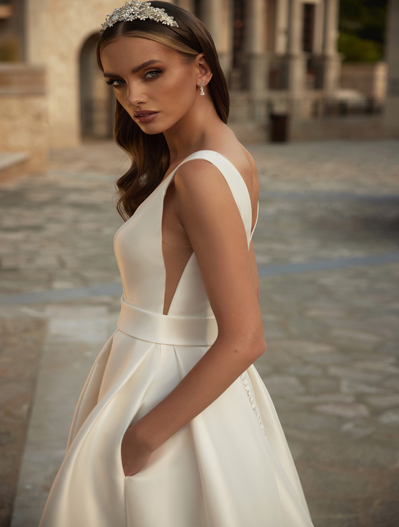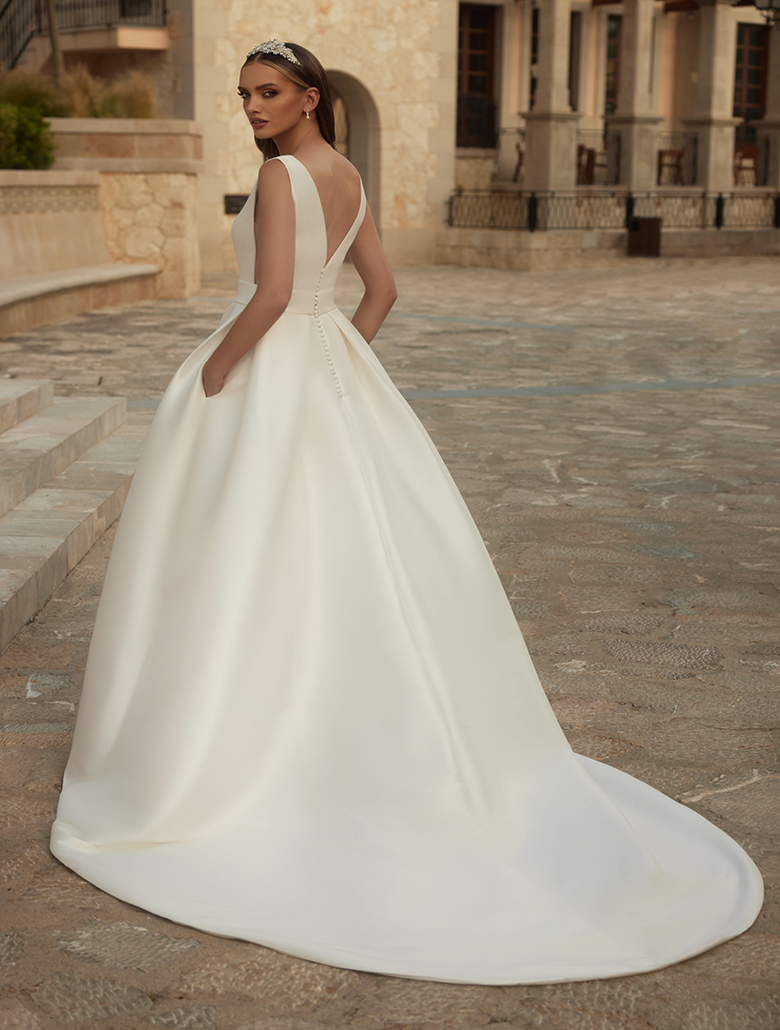 ,,Opal“ ist ein Prinzessinnen-Brautkleid aus hochwertigem Mikado-Stoff. Das klassische Brautkleid ist ärmellos und kommt mit einem V-Ausschnitt vorne und hinten.