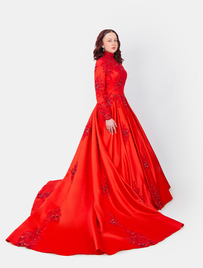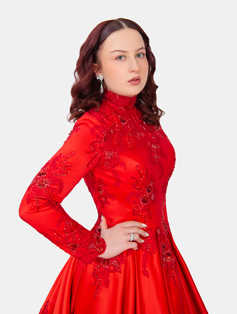 Das Abendkleid ,,Alice“ von Irvalda Abendmode Wien ist ein atemberaubendes Couture-Modell für besondere Anlässe. Der hochgeschlossene Stehkragen, die eleganten langen Ärmel und die kunstvollen, ton-in-ton Stickereien verleihen dem Kleid einen majestätischen und luxuriösen Charakter. Die leuchtend rote Farbe macht ,,Alice“ zu einem echten Blickfang – ideal für Galaabende, Verlobungsfeiern, Henna-Abende oder besondere Familienfeste.