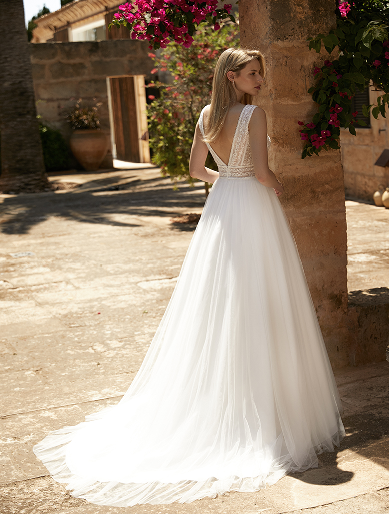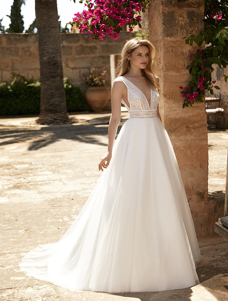 ,,Electra“ ist ein elegantes Brautkleid in A-Linie, das aus hochwertigem Tüll und Spitze gefertigt wurde. Das ärmellose Kleid hat einen V-Ausschnitt und ist geschmackvoll mit wunderschöner Spitze verziert. Dieses moderne Brautkleid ist in allen Belangen ein wahrer Blickfang.