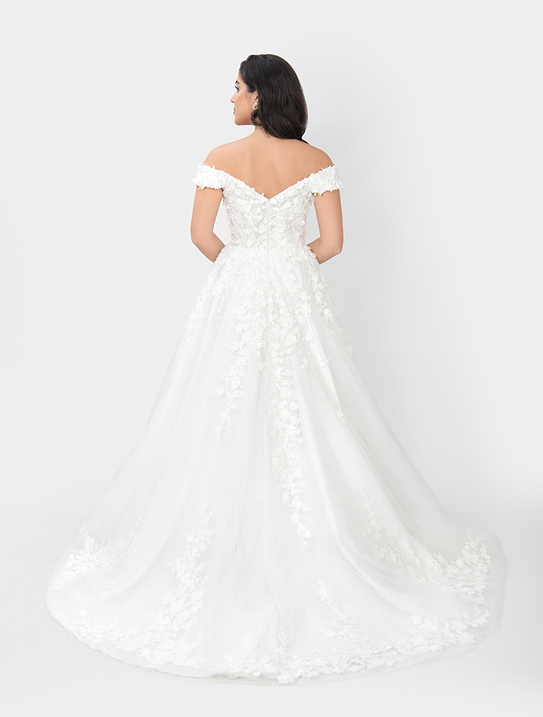 Der fließende A-Linien Rock besteht aus mehreren Lagen weichen Tülls und ist ebenfalls mit 3D-Blüten und zarter Spitze dekoriert. Diese Details sorgen für ein harmonisches Gesamtbild und bringen das Kleid bei jeder Bewegung zum Strahlen. Die leichte Schleppe rundet den Look perfekt ab und verleiht ihm zusätzliche Eleganz. ,,Flower 2“ ist ideal für Bräute, die ein romantisches Blüten-Brautkleid, ein Off-Shoulder Hochzeitskleid oder ein Couture-inspiriertes A-Linie Kleid suchen.