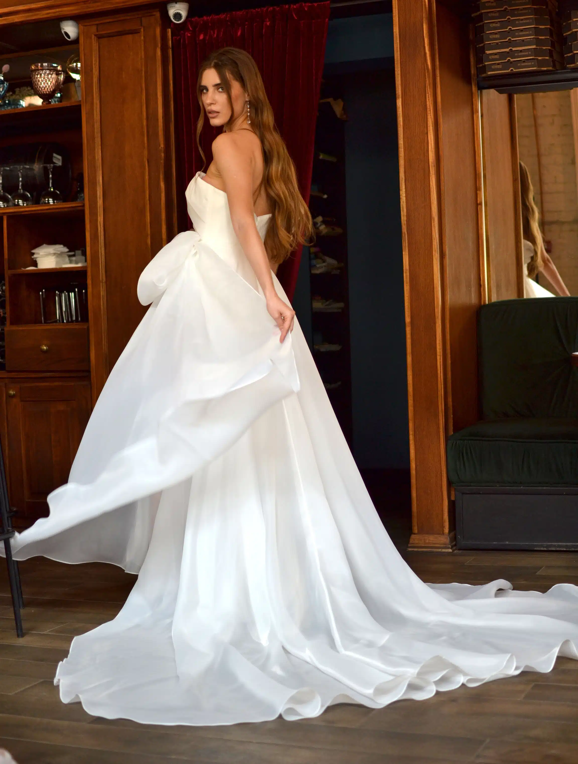 The straight-shaped skirt is designed with a subtle curve slit, lending a modern edge to the classic silhouette. An overlaying organza skirt enhances the design with its fluid, flowing movement. The front of the skirt is adorned with meticulously placed organza pleats, adding depth and dimension. To finish this heavenly creation, a playful organza bow with trailing tails is fixed at the side, offering a whimsical yet sophisticated accent. „Heaven“ is a perfect blend of contemporary design and timeless elegance, ideal for those seeking a unique and captivating ensemble.