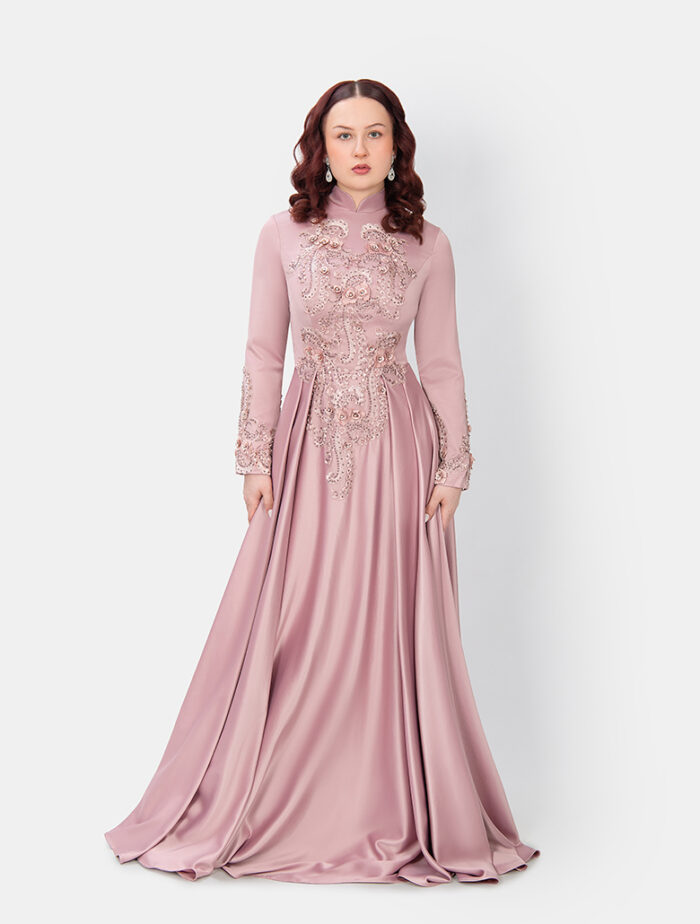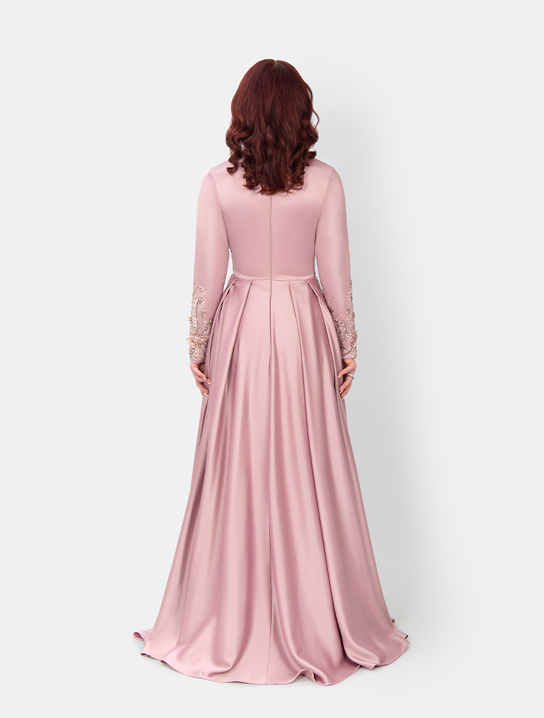 Der weich fallende A-Linien Rock aus hochwertigem, satiniertem Stoff sorgt für eine majestätische Ausstrahlung und eine elegante Bewegung. Der zarte Rosé-Ton (Dusty Rose) rundet den Look harmonisch ab und macht ,,Mabel“ zu einem echten Highlight für besondere Anlässe. Dank seines hochgeschlossenen Designs und der komplett bedeckten Silhouette ist dieses Modell hijab-friendly und lässt sich perfekt mit einem passenden Kopftuch oder Schal kombinieren.