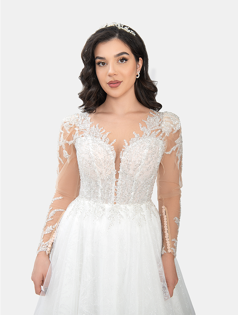 Das Brautkleid ,,Mia“ von Irvalda Brautmode Wien ist ein elegantes und glamouröses Hochzeitskleid für Bräute, die ein besonders edles und detailreiches Design suchen. Das Oberteil besticht durch einen tiefen V-Ausschnitt mit Illusion-Tüll sowie prachtvollen, silbrig-glitzernden Spitzenapplikationen, die eine luxuriöse und feminine Silhouette formen. Die langen Ärmel aus transparentem Tüll, ebenfalls mit funkelnder Spitze verziert, verleihen dem Kleid eine royale Ausstrahlung.