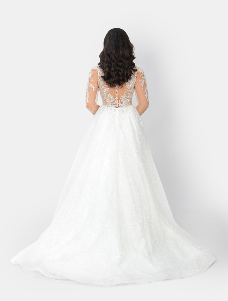 Der voluminöse A-Linien Rock mit glitzernder Struktur bewegt sich sanft und majestätisch und sorgt für einen harmonischen Übergang vom reich verzierten Oberteil zum eleganten Rock. Die feinen Glitzerdetails im Stoff bringen das Kleid zum Strahlen – perfekt für eine große Hochzeitsfeier. ,,Mia“ ist ideal für Bräute, die ein glamouröses, funkelndes und elegantes Spitzen-Ballkleid suchen.