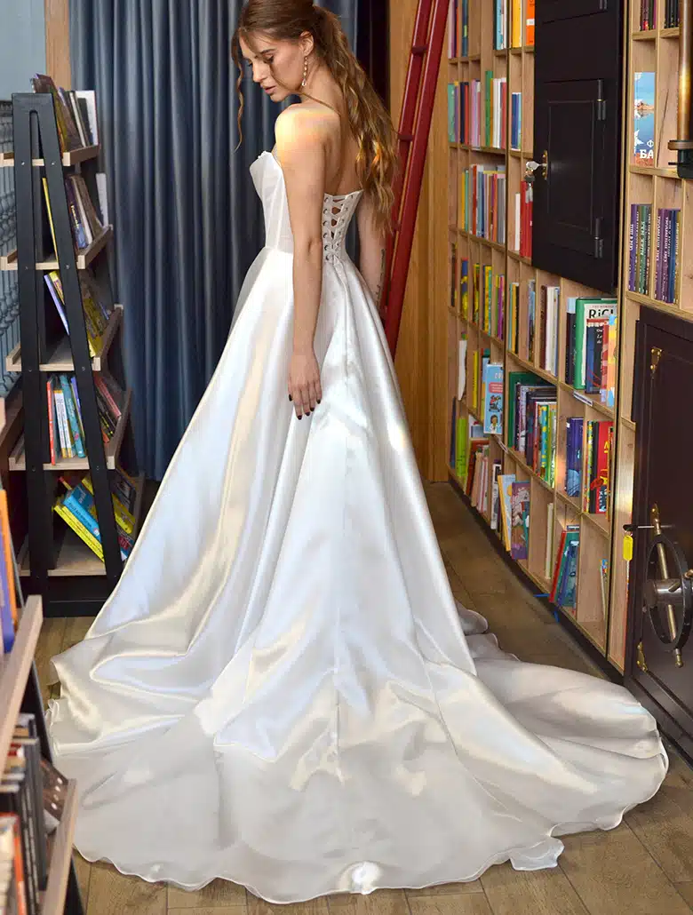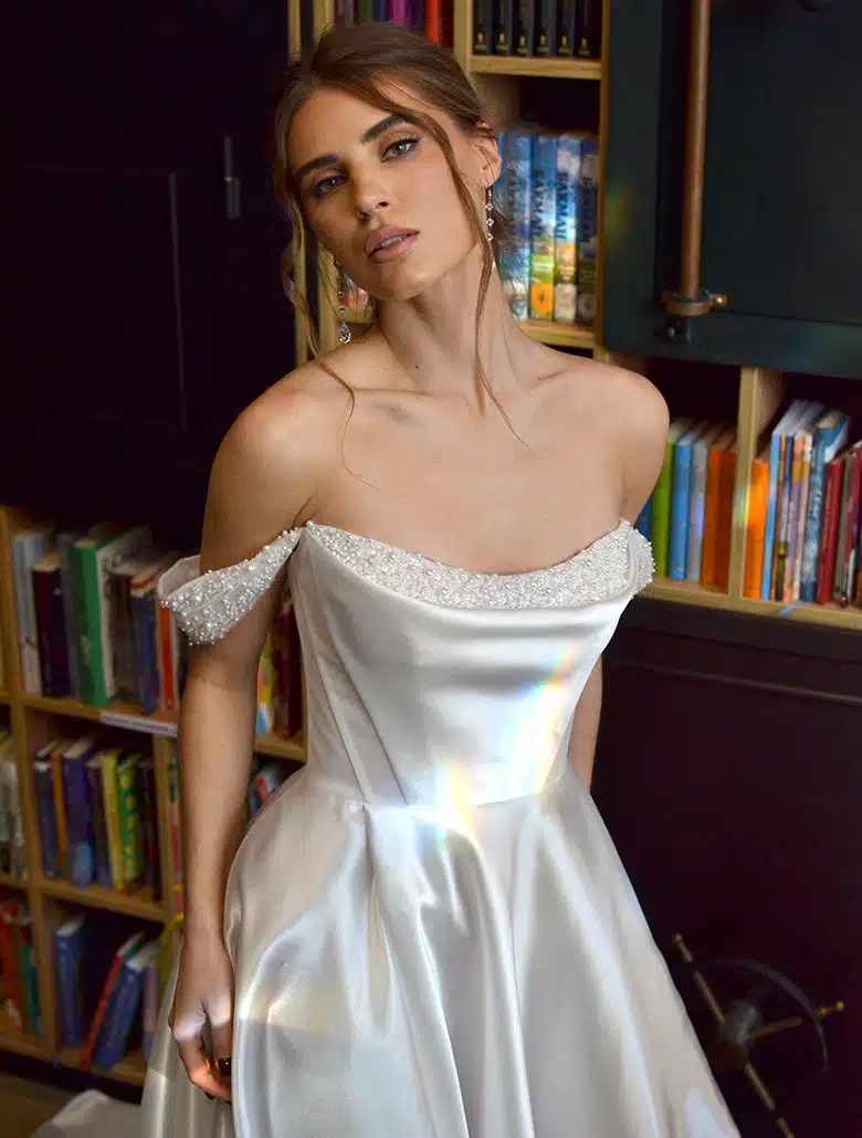 Dive into a sea of sophistication with our latest creation, „Ocean.“ This stunning silk organza dress is designed to make waves with its unique features and timeless allure. At the heart of „Ocean“ lies a beautifully crafted corset, featuring an open lacing-up design that adds a touch of drama and allure. The scoop shape corset, made of delicate organza, is complemented by corset mesh sides and back, ensuring a flattering and comfortable fit. Adorned with intricate lace off-shoulder straps and detachable fitted sleeves, „Ocean“ offers versatility for the modern bride. Whether you choose to wear them for added romance or opt for a more minimalist look, these detachable elements allow you to customize your bridal ensemble with ease.