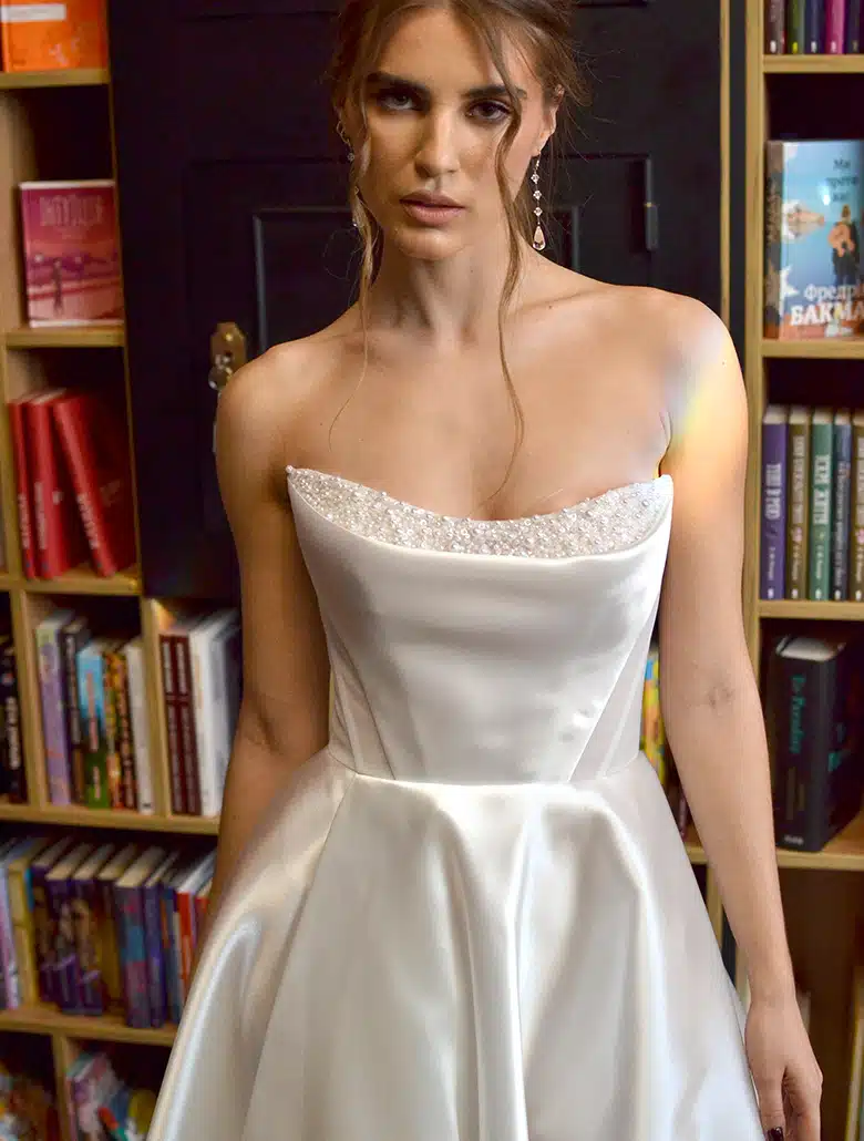 The skirt of „Ocean“ features a daring slit, adding a hint of allure and movement to the silhouette. Crafted from luxurious silk organza, the skirt drapes effortlessly, creating a sense of ethereal beauty with every step. But perhaps the crowning jewel of „Ocean“ lies in its meticulously handcrafted cups, covered with beaded lace and adorned with pearls. Each pearl is placed with care, adding a touch of opulence and sophistication to the ensemble. With its exquisite details and timeless elegance, „Ocean“ is the perfect choice for the modern bride who seeks to make a statement on her special day. Embrace the allure of the ocean and let „Ocean“ carry you away on a tide of romance and beauty.