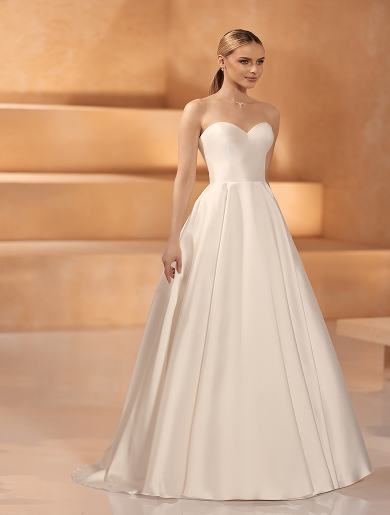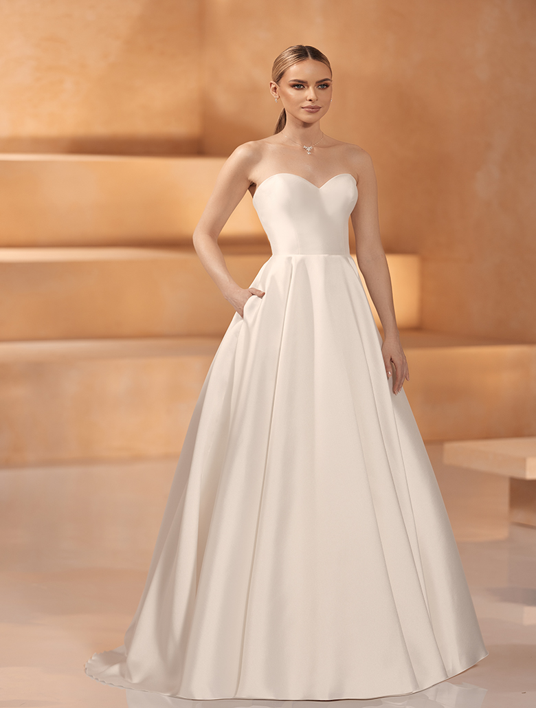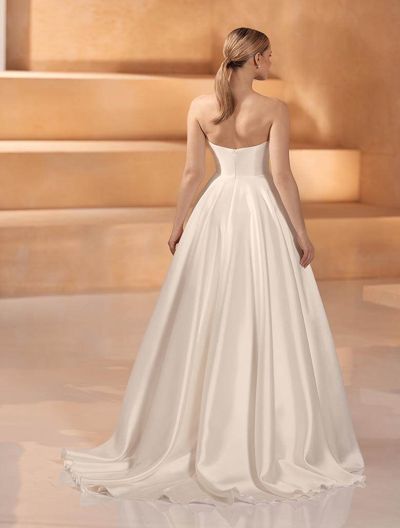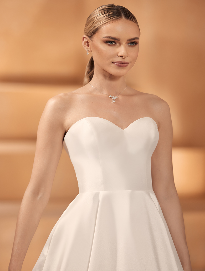 ,,Olga“ ist ein wunderschönes Prinzessinnen-Brautkleid. Dieses ärmellose Brautkleid zeigt eine wunderschöne Kathedralschleppe mit herzförmigem Ausschnitt und offenem Rücken.