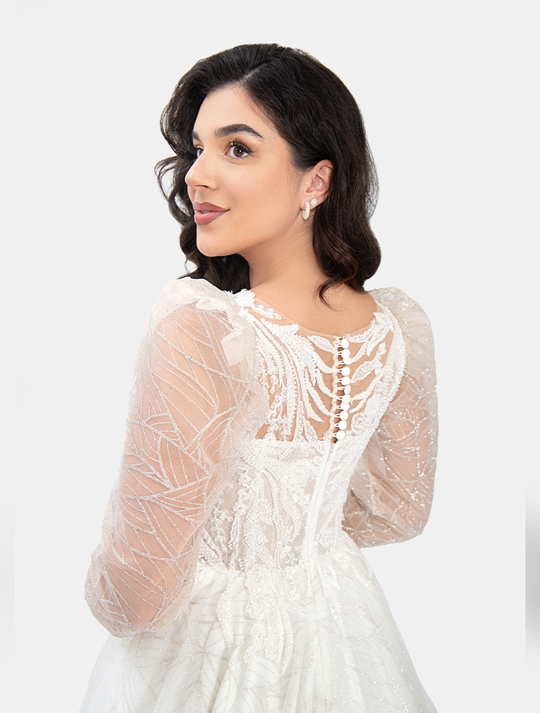 Das Brautkleid ,,Vally“ von Irvalda Brautmode Wien ist ein Statement aus Eleganz, Glamour und feiner Couture-Optik. Das Oberteil beeindruckt mit einem tiefen V-Ausschnitt, kombiniert mit transparenter, kunstvoll bestickter Spitze, die einen modernen und zugleich luxuriösen Look schafft. Die langen Ärmel aus feinem Illusion-Tüll mit detailreicher Stickerei verleihen dem Kleid eine exklusive, hochwertige Ausstrahlung – perfekt für Herbst- und Winterhochzeiten oder Bräute, die ein prächtiges Spitzenkleid suchen.
