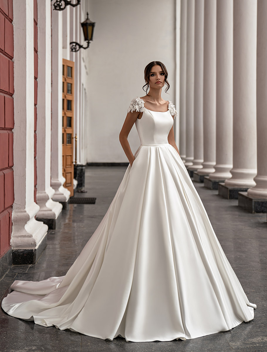 A beautiful A-line style wedding dress with a long train. The dress is made of high quality royal satin, has short sleeves decorated with guipure and 3D flowers. The back is half open.