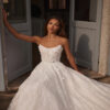 In einem luftigen A-Linien-Kleid aus besticketer Spitze in ,,Hellhaut“ – Farbe schwebt die Braut wie auf Flügeln in den Armen Ihres Liebsten beim ersten Hochzeitstanz. Das halbtransparente korsett mit U-Boot-Ausschnitt ist mit Spitze in 3D-Farben verziert. Der Rücken ist auf Höhe der Schulterblätter leicht konkav. Das Korsett wird mit einem verdeckten Reißverschluss geschlossen.