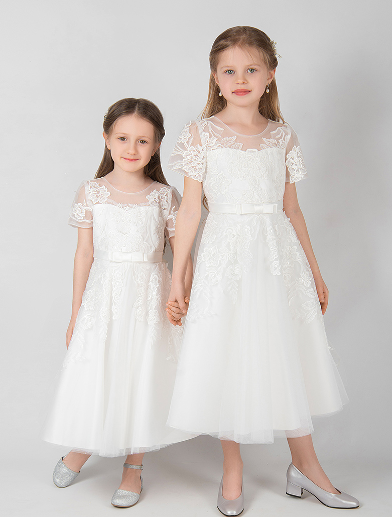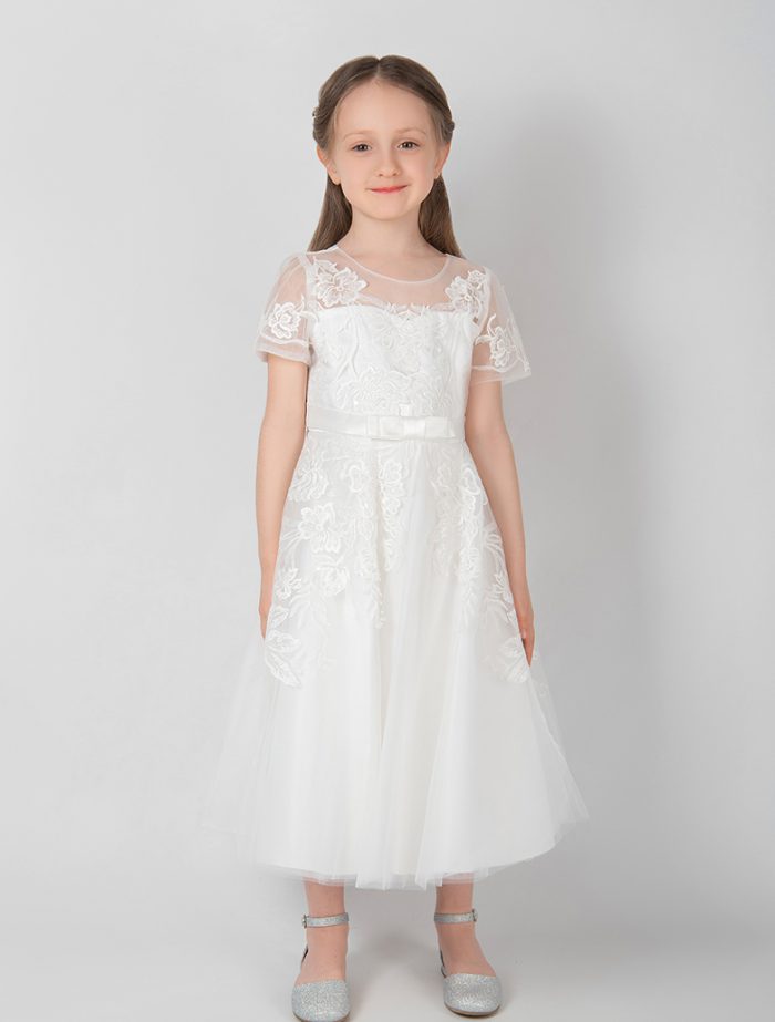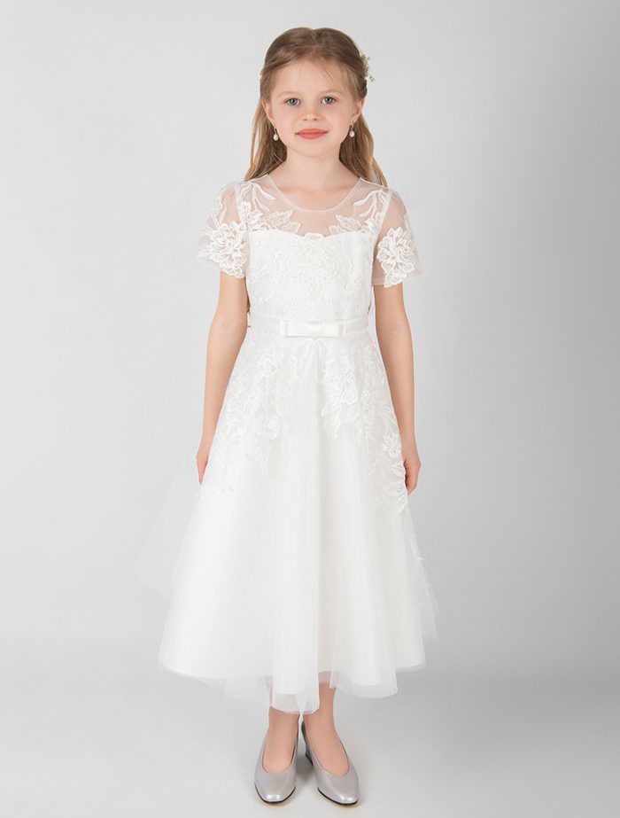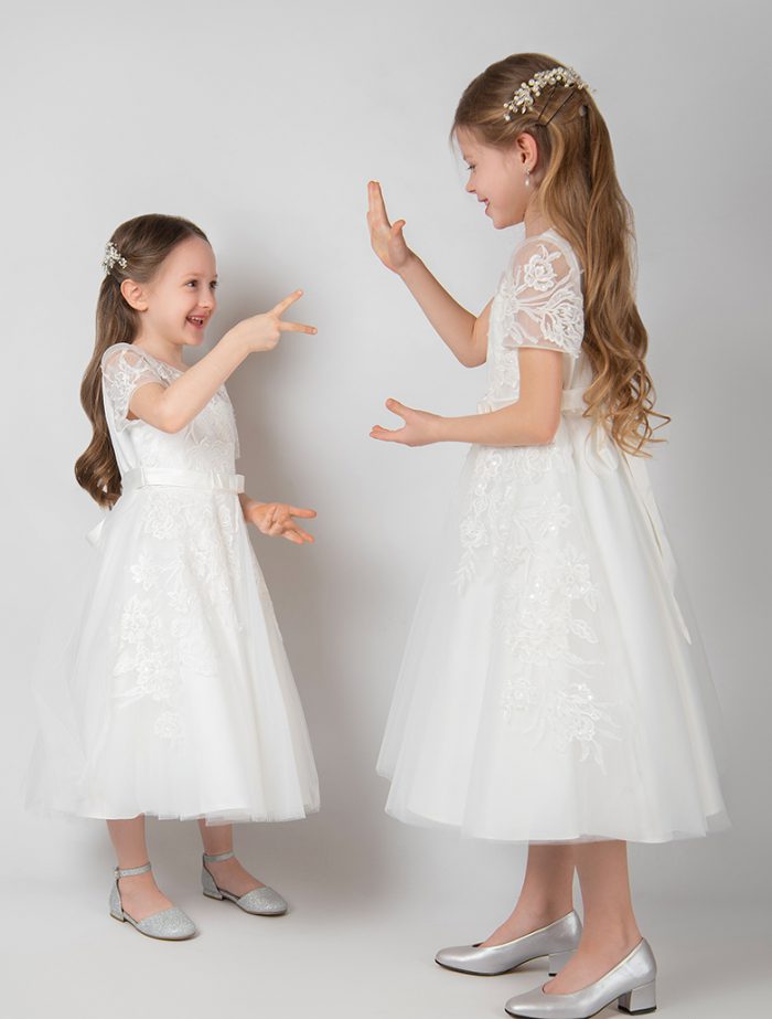 A beautiful children’s dress for a real princess. The model has a corsage decorated with lace. The skirt is made of tulle with lace. The back is closed and has a zipper.