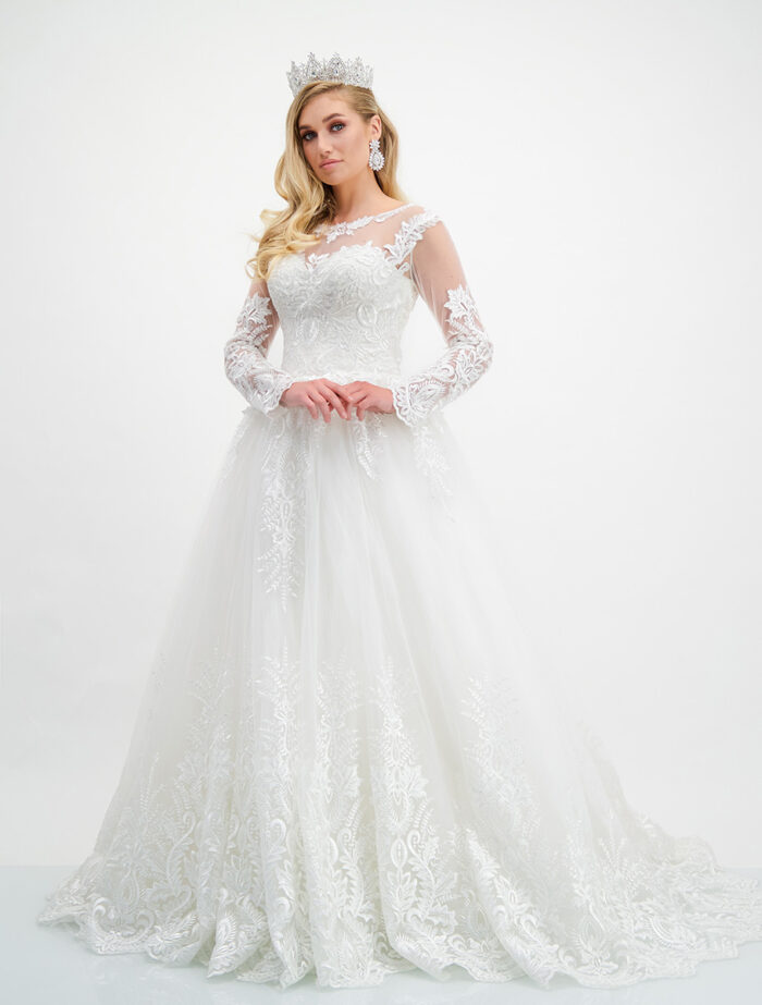 A gorgeous wedding dress with a long princess-style train. The model has long sleeves. Both the corset and the sleeves are decorated with guipure. The back is closed and has buttons.