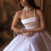 Die anspruchsvollste Braut wird in diesem elfenbeinfarbenen A-Linien-Kleid eine zarte und elegante Prinzessinnen-Ausstrahlung erlangen und zum strahlenden Mittelpunkt jedes bezaubernden Festes werden. Das Oberteil aus Satin hat einen geraden Halsausschnitt und ist im Rückenbereich unterhalb der Schulterblätter leicht konkav. Es ist mit Falten aus Mikado-Stoff verziert und wird mit Haken in der hinteren Mitte geschlossen.
