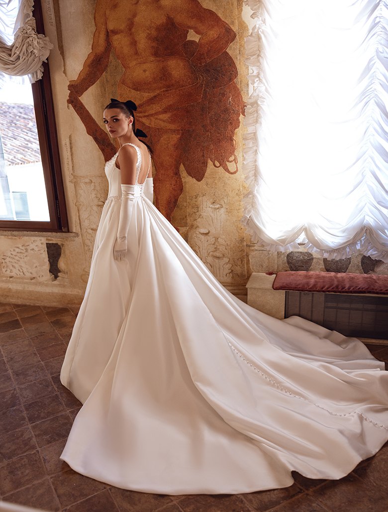 Der weite Rock im A-Linien-Schnitt fällt in eleganten Falten und geht in eine lange, königliche Schleppe über, die dem Kleid eine beeindruckende Wirkung verleiht.