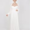 A beautiful A-line style wedding dress with a sweetheart neckline. This model is made of chiffon, has long cap sleeves decorated with lace elements. The back is closed but semi-sheer and has both buttons and a zipper.