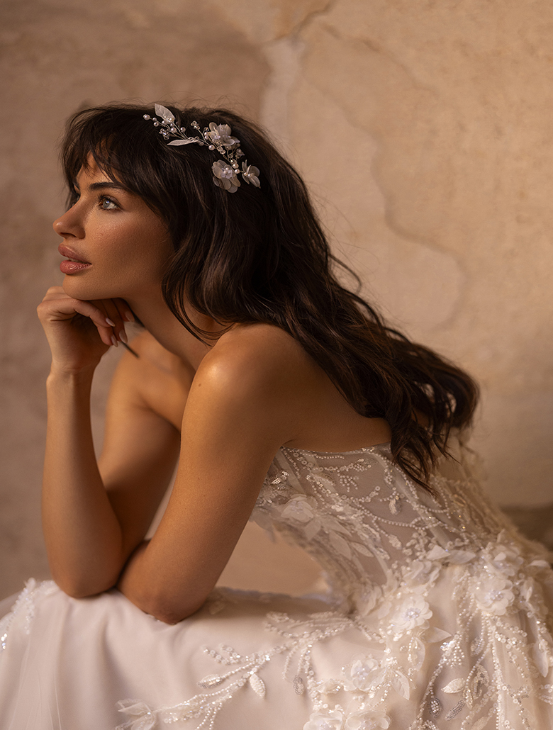 Ein üppiges A-Linien-Brautkleid in hellem Hautton betont gekonnt die Taille und lenkt den Blick auf das Dekolleté. Das halbtransparente Oberteil hat einen U-Boot-Ausschnitt und einen hautfarbenen Netzeinsatz in der Mitte des Vorderteils, der bis zur Taille reicht. Der Rücken ist unterhalb der Schulterblätter leicht geschwungen. Das Oberteil ist aus einem zarten Glanzstoff gefertigt und mit feinen Stickereien und Spitze in 3D-Optik verziert. Das Korsett wird mit einem verdeckten Reißverschluss in der hinteren Mitte geschlossen.