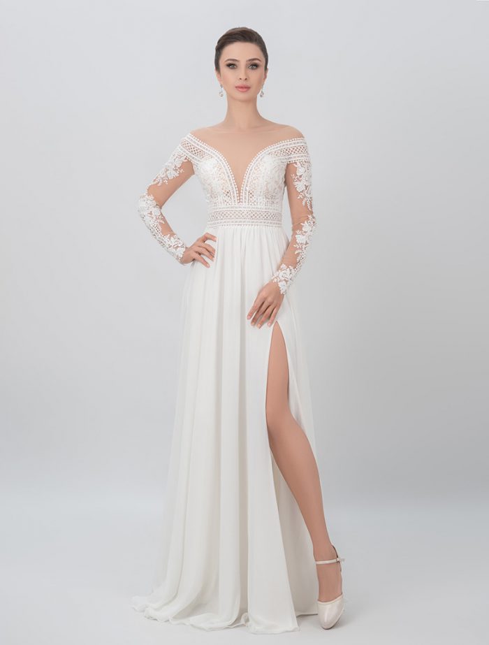 A beautiful A-line style wedding dress with a long train. The model has long sleeves and is made of chiffon. The dress has a great corsage made from lace. The neckline is V-shaped and the back is open.