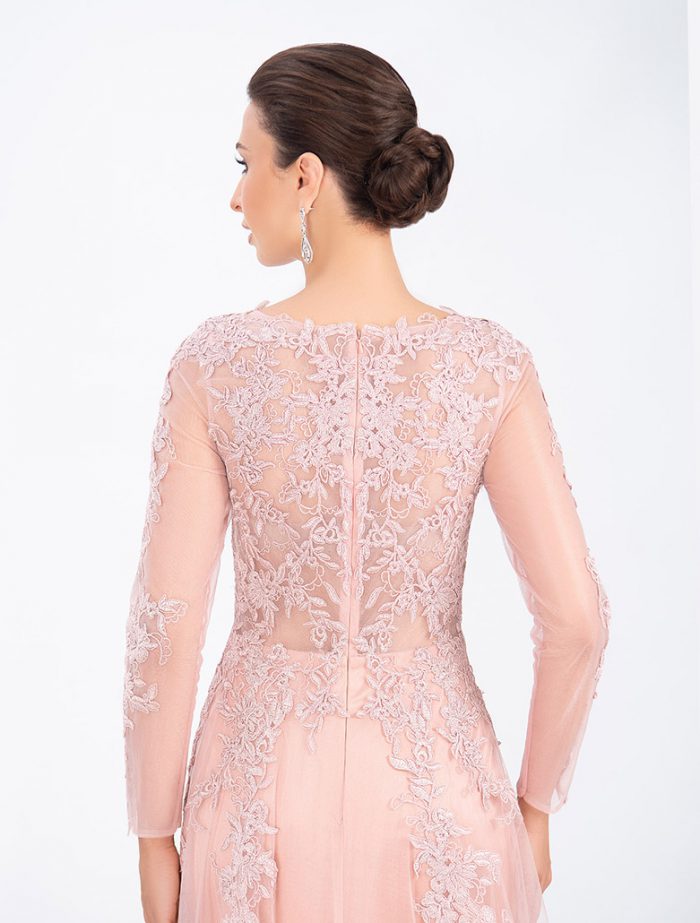 Ein elegantes Abendkleid in A-Linie Stil hat lange Ärmel. Dieses Modell passend zu verschiedenen Anlässen. Das Kleid ist mit Spitze verziert, hat einen Rundhalsausschnitt und einen geschlossenen Rückenteil.