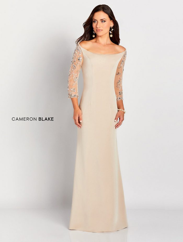 Dieses von Designerhand gefertigte cremige Abendkleid verfügt über einen schmeichelnden Off-Shoulder-Ausschnitt, der Glamour und Raffinesse ausstrahlt. Das Kleid hat lange Ärmel aus Spitze. Erhältlich in US-Größe 12.