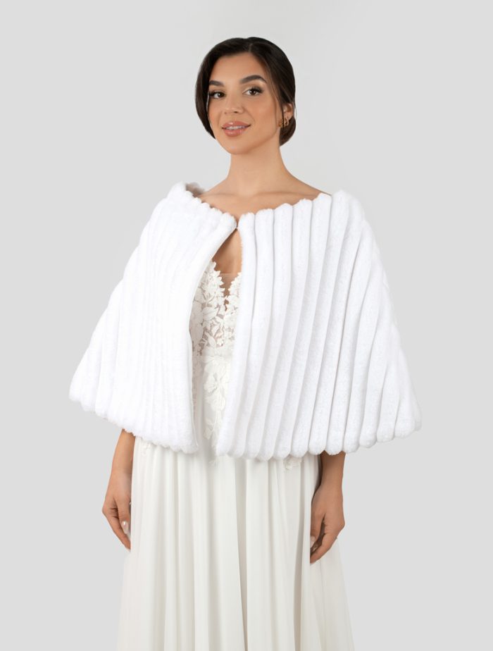 This elegant faux fur bolero, measuring 50 cm in length with a 40 cm shoulder width, is perfect for weddings, special occasions, or evening wear. It adds a touch of sophistication and warmth to any bridal or formal outfit.