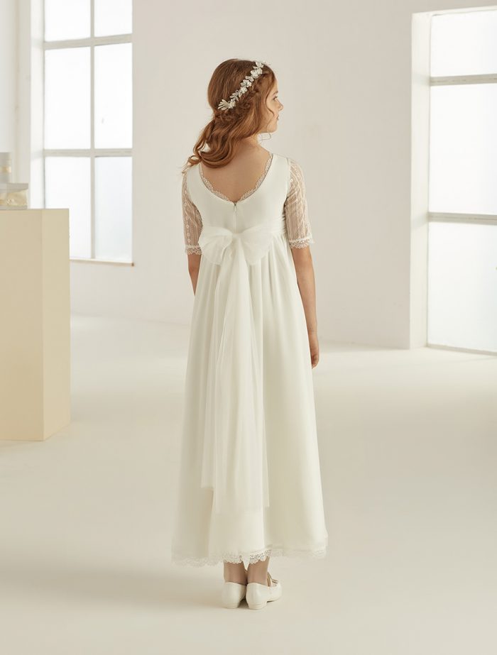 - kleine Spitzenärmel, mit Spitze gefütterter Ausschnitt
