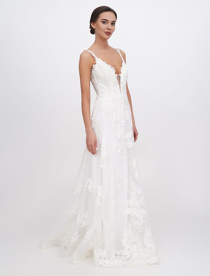 Dieses schönes Brautkleid ist aus Tüll gefertigt und hat dicke Träger. Der Ausschnitt ist V-förmig. Die Corsage und der Rock sind mit Spitze verziert. Der Rückenteil ist offen und hat einen Reißverschluss.