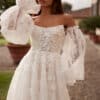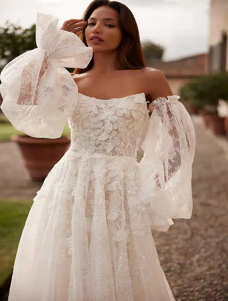 der voluminöse Spitzenrock mit üppiger Schleppe ist kunstvoll mit 3D-Blumen verziert, die der Form des Korsetts folgen. Auch der Rock wird mit einem verdeckten Reißverschluss geschlossen. das Kleid ist auch in Elfenbein erhältlich. Volumiöse, abnehmbare Ärmel aus transparenter, bestickter Spitze runden den luxuriösen Look der Braut perfekt ab.