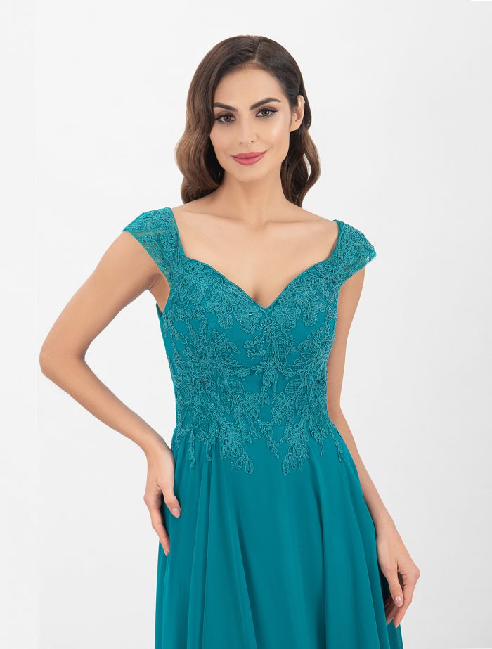 Ein elegantes Abendkleid in Fit-and-Flare Stil. Dieses Modell besitzt eine wunderschöne Corsage, die komplett mit Spitze gefertigt ist. Das Kleid hat einen Carmen-Ausschnitt. Der Rückenteil ist halboffen und hat einen Reißverschluss. Das Kleid selbst ist aus Chiffon gefertigt. Dieses Kleid ist in den Farben Königsblau (Hellblau), Marineblau (Blau) und in Grün erhältlich.