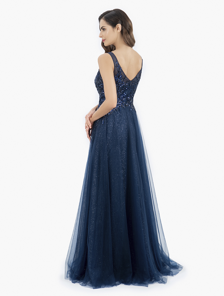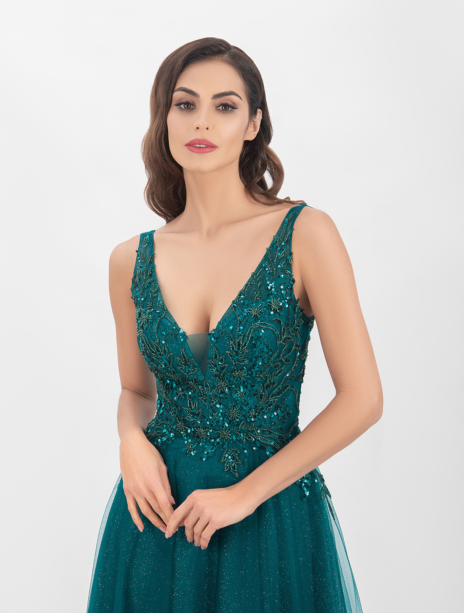 Ein elegantes Abendkleid in A-Silhouette Stil ohne Schleppe. Dieses Modell besitzt eine wunderschöne Corsage, die komplett mit Pailletten und Glasperlen dekoriert ist. Der Ausschnitt sowohl vorne, als auch hinten ist V-förmig. Der Rückenteil ist halboffen und hat einen Reißverschluss. Das Kleid selbst ist aus Tüll gefertigt.