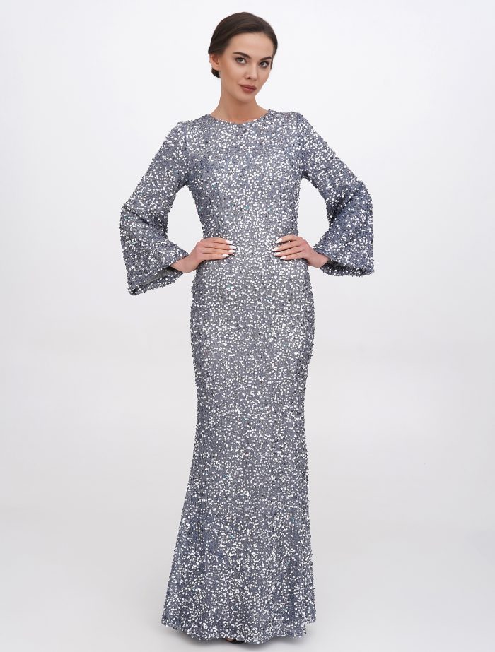 Ein bezauberndes silbernes Abendkleid im Fit-and-Flare-Stil. Diese Modell ist komplett mit Pailletten dekoriert. Der Ausschnitt sowohl vorne, als auch hinten ist Rundhalsausschnitt. Der Rückenteil ist halboffen und hat einen Reißverschluss. Die Glockenärmel dieses Kleides verleihen Ihrem Abend-Ensemble einen Hauch von Bohemian-Charme.