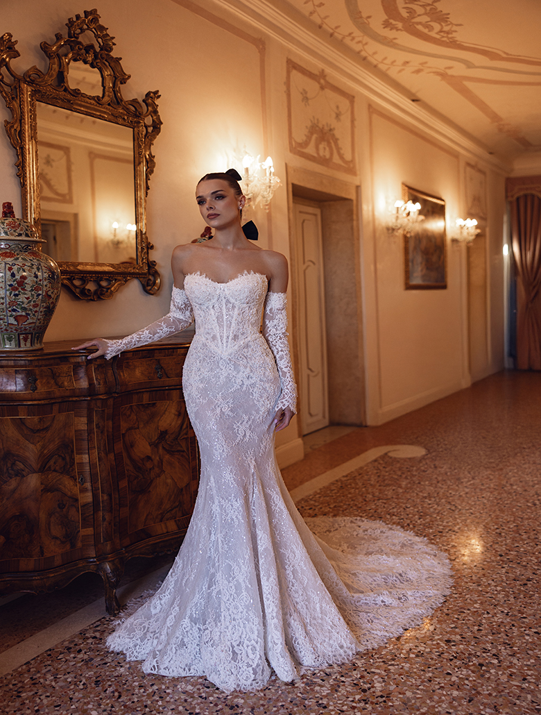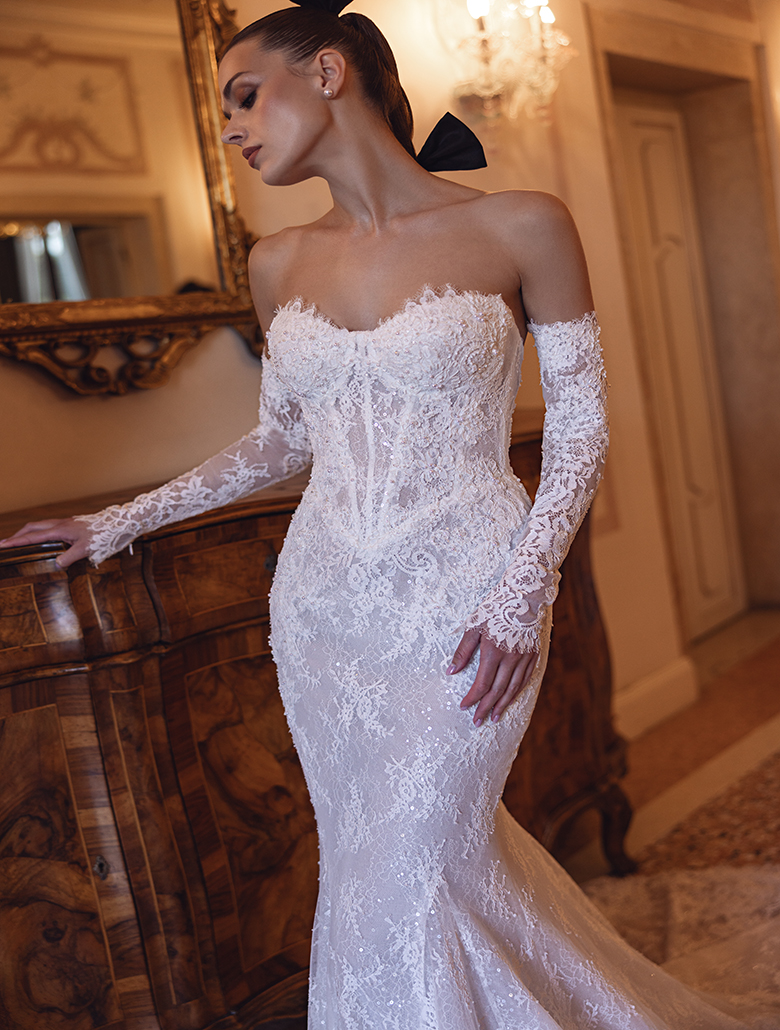 Das herzförmige Korsett mit sichtbaren Stäbchen betont die Figur und sorgt für eine elegante Silhouette. Zarte Spitzenärmel, die leicht von den Schultern fallen, verleihen dem Kleid eine romantische Note und unterstreichen den modernen Charakter.