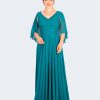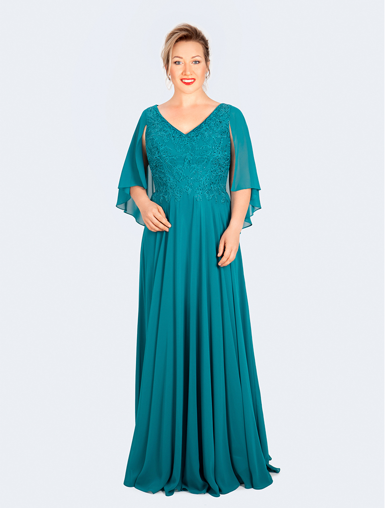 Ein bezauberndes Abendkleid aus Chiffon, das sehr zart und wunderschön aussieht. Das Modell hat Flügel-Ärmel, die Corsage ist mit Spitze verziert, die mit Steinchen dekoriert ist. Der Rückenteil ist geschlossen und hat einen Reißverschluss.