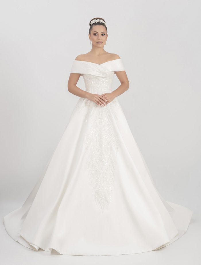 Ein echtes königliches Brautkleid aus Mikado mit einer langen Schleppe. Dieses Modell ist einfach unglaublich schön. Die Corsage ist mit Glasperlen bestickt. Der Ausschnitt ist in Carmen Stil gefertigt. Der Rückenteil ist halboffen und besitzt einen Reißverschluss.
