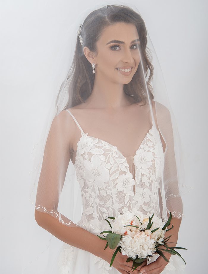 Ein wunderschönes, zartes Hochzeitskleid mit einer langen Schleppe in Prinzessin-Stil. Dieses Modell hat dünne Träger, einen tiefen V-Ausschnitt und einen halboffenen Rückenteil mit einem Reißverschluss. Die Corsage ist komplett mit Spitze verziert. Der Rock ist aus Tüll gefertigt.