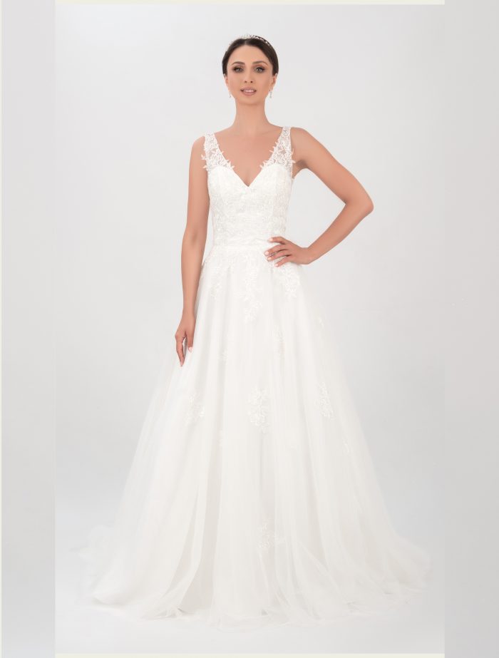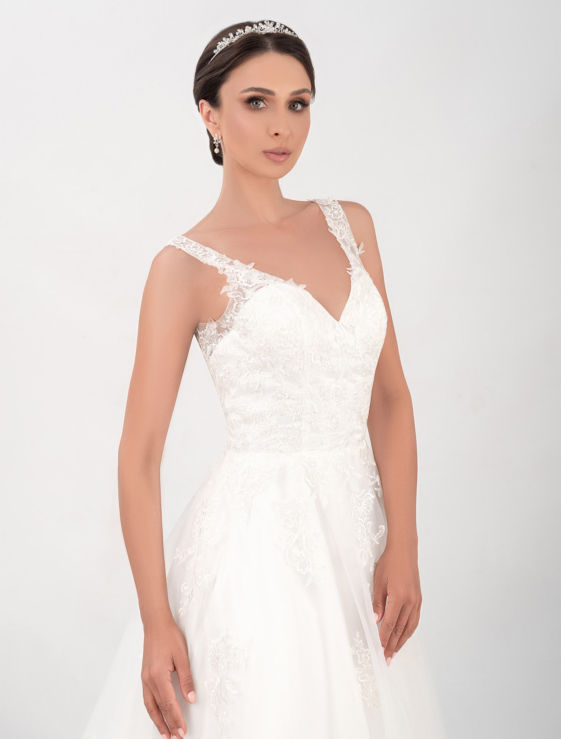 Dieses wunderschöne Hochzeitskleid in Prinzessinnen Stil ist ein echtes Kunstwerk. Das Modell ist aus Tüll gefertigt und die Corsage und der Rock sind mit Spitze verziert. Das Kleid hat einen V-Ausschnitt und ist ohne Ärmel. Der Rückenteil ist offen und hat einen Reißverschluss.