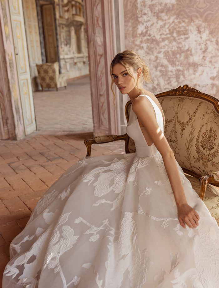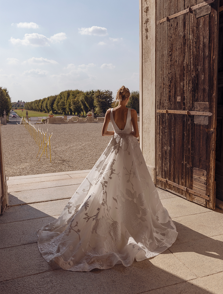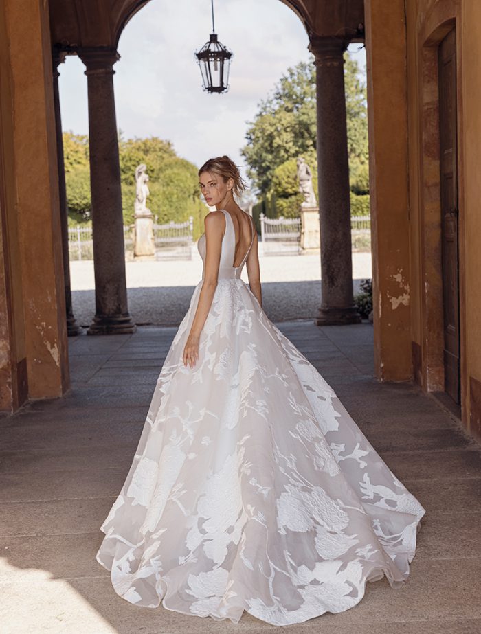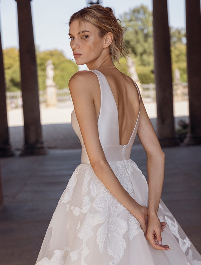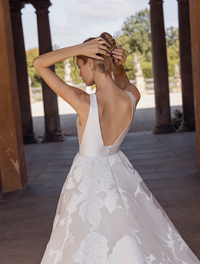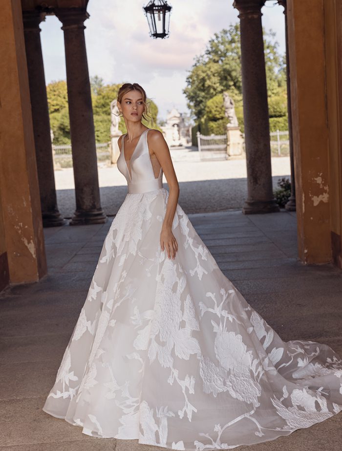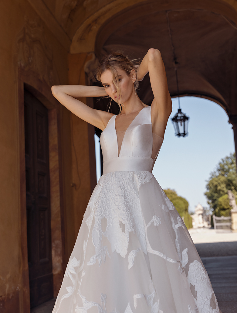 Ein königliches Hochzeitskleid für eine echte Prinzessin. Die Corsage ist aus hochwertigem königlichem Satin gefertigt, hat einen V-förmigen Ausschnitt sowohl vorne, als auch hinten. Der Rock ist aus Tüll gefertigt und ist mit Spitze-Elementen dekoriert.