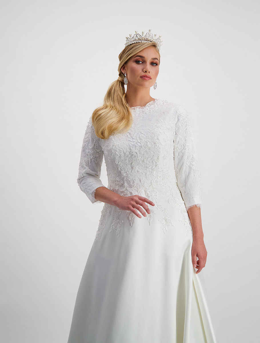 Ein super tolles geschlossenes Brautkleid ohne Schleppe in A-Linie Stil. Das Modell hat 3/4 Ärmel. Sowohl Korsett, als auch Ärmel sind mit Guipure bestickt. Der Rückenteil ist geschlossen und hat die Knöpfe.